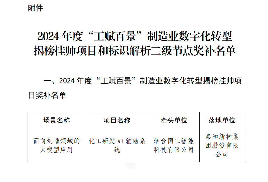 6月3日,省工信廳發(fā)布《關于2024年度“工賦百景”制造業(yè)數字化轉型揭榜掛帥項目和標識解析二級節(jié)點獎補公示名單》,作為全省33個通過驗收的項目之一,由國工智能與泰和新材揭榜掛帥的面向制造領域的大模型應用——“化工研發(fā)AI輔助系統”項目榜上有名。