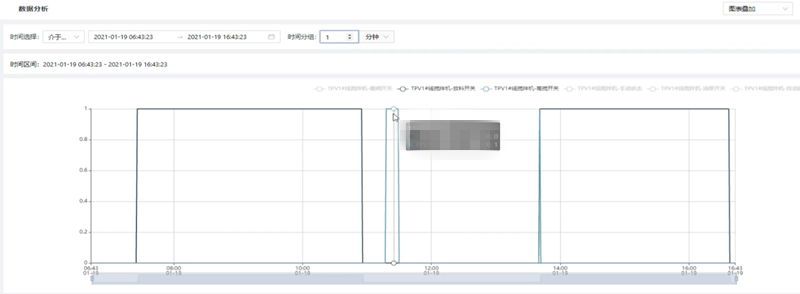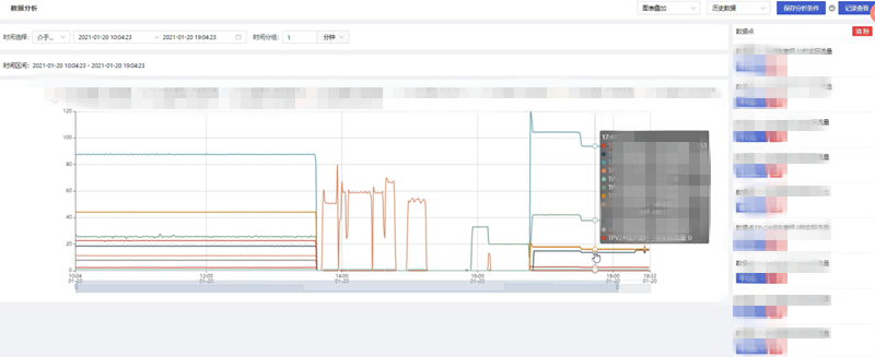根據用戶的需要,對一段時間內的歷史數據或實時數據按照一定的統(tǒng)計頻率進行多個維度的數據分析,統(tǒng)計頻率包含不限、10秒、30秒、10分鐘、30分鐘、1小時,通過添加變量操作,在彈出的變量選擇彈窗中可多選數據點信息進行分析;數據分析得到的圖表顯示形式包括折線圖以及表格形式。多個數據點信息圖表的展示形式包括平鋪、疊加、標簽顯示以及合并表格顯示,根據不同的需求選擇對應的展示形式,靈活性高。數據分析幫助用戶分析用戶想要分析的內容,如數據走向,問題等,可以將分析的邏輯進行保存并可以按部門和人員進行公開,從而幫助用戶解決問題。(可參考圖1.1)