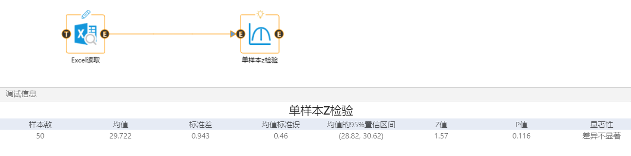 使用集成好算法的單樣本 Z 檢驗組件進行數據的分析處理,對組件參數進行設置,假設均值為29,已知標準差為3.25,顯著性水平設置為0.05,單擊運行,從調試面板中查看分析結果。