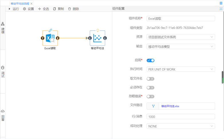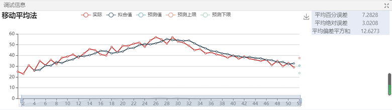 ②使用集成好算法的移動平均法組件對數據進行預測,對組件參數進行設置,樣本設置為number,預測值個數設置為1,移動平均長度設置為3,單擊運行,從調試面板中查看分析結果。