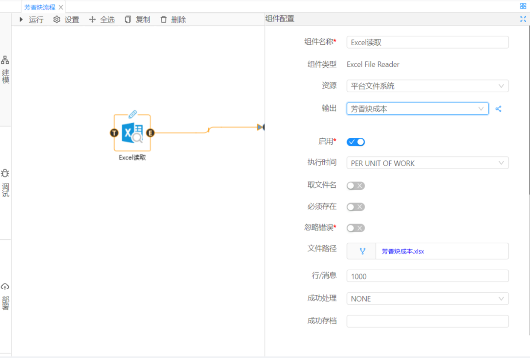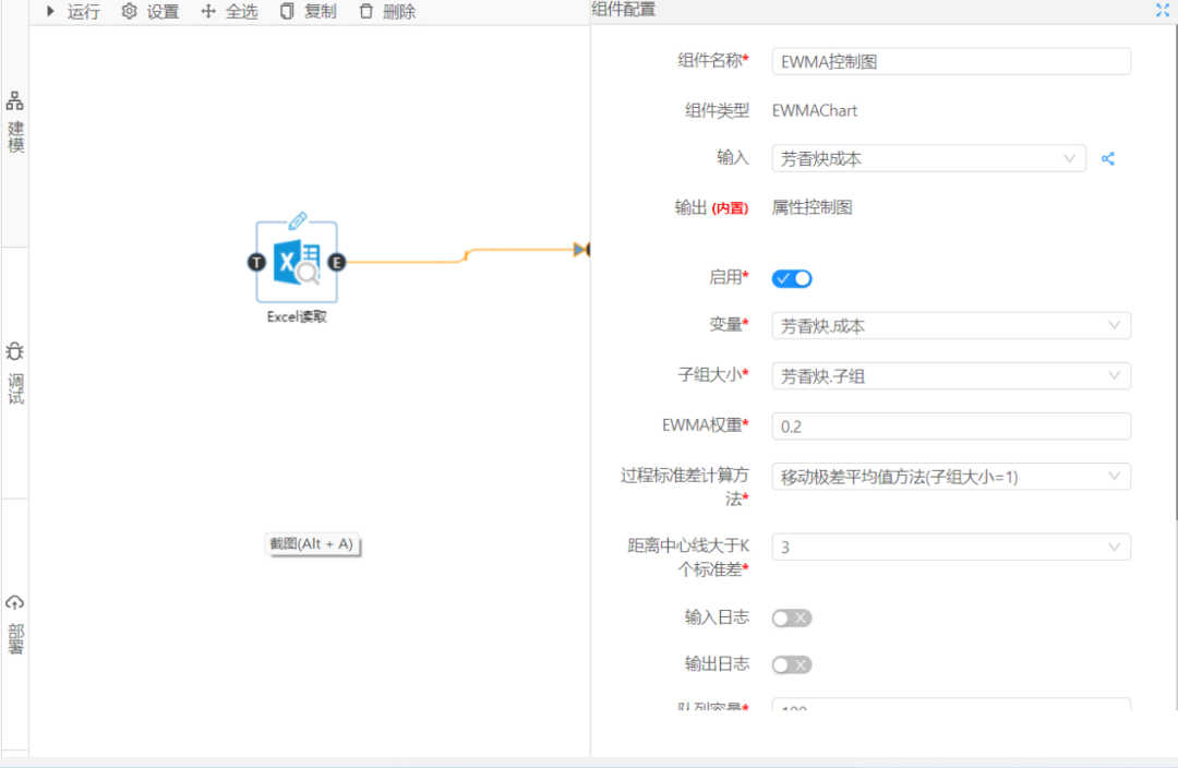 首先選取數據大腦的Excel讀取組件和EWMA控制圖組件,配置好相關資源,之后點擊左側的調試按鈕,如圖2,3所示: