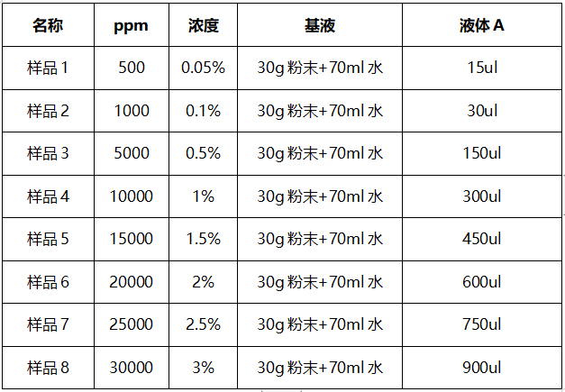 稱30g粉末至容器中,取70ml蒸餾水,按照邊攪拌邊加水的方式將樣品攪拌均勻,作為基液。