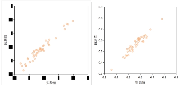 左圖為某類高分子材料斷裂伸長率預(yù)測結(jié)果(R2=0.96),右圖為斷裂強(qiáng)度預(yù)測結(jié)果(R2=0.90)(數(shù)據(jù)已進(jìn)行脫密處理)。