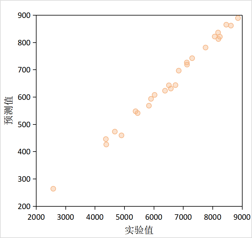 上圖為某類高分子材料聚合后數(shù)均分子量(線性相關(guān)系數(shù)為0.98)預(yù)測結(jié)果,即使對聚合體系進(jìn)行了等比例縮小,預(yù)測值和實(shí)驗(yàn)值仍然具有良好的線性相關(guān)性(數(shù)據(jù)已進(jìn)行脫密處理)。