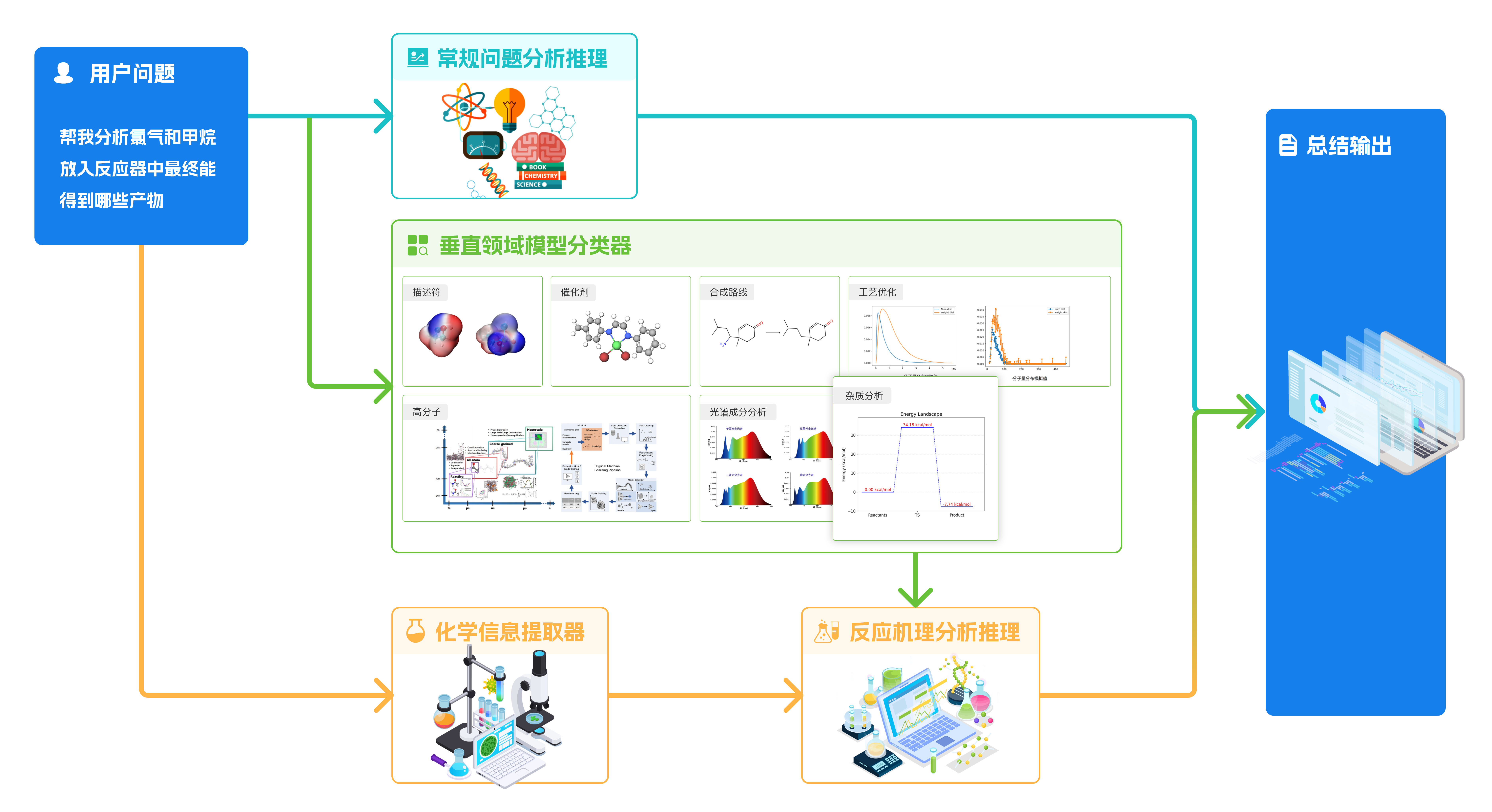 「國工化工大模型」改變了大模型的“文科生”設(shè)定,朝著“理科生”深度進化。大模型技術(shù)與國工智能AI for Science領(lǐng)域的垂直能力深度融合,針對具體問題進行識別后,聯(lián)動調(diào)用「合成推演」、「催化劑設(shè)計」、「分子動力學(xué)及計算化學(xué)描述符構(gòu)效關(guān)系計算」、「構(gòu)效關(guān)系計算」、「產(chǎn)物預(yù)測」、「量熱預(yù)測」、「實驗/工藝優(yōu)化」、「高分子配方與性能預(yù)測」、「譜圖逆分析」等15種垂直領(lǐng)域模型進行協(xié)同分析,真正實現(xiàn)大模型在化工場景的“深度思考”。