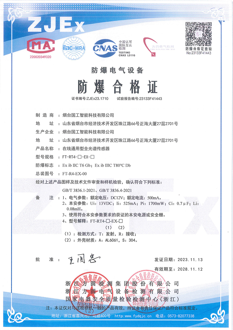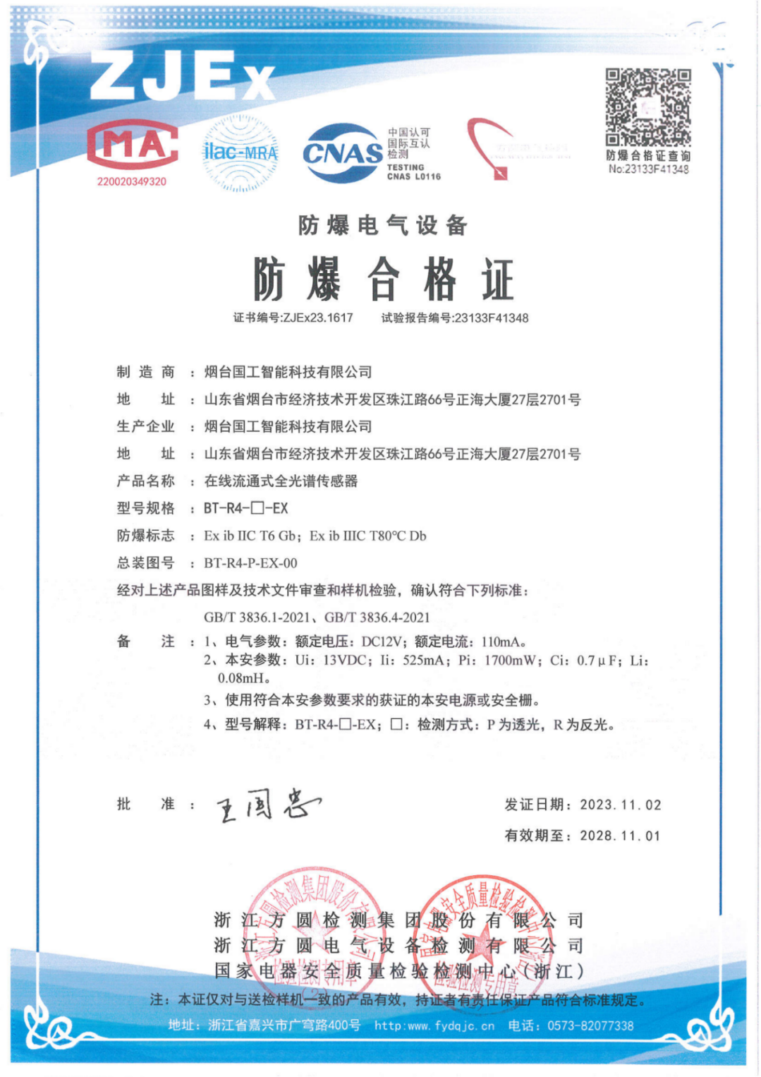 近日,國工智能的全光譜傳感器系列產(chǎn)品:“在線流通式全光譜傳感器”,“在線通用型全光譜傳感器”拿下“本安型防爆合格證。