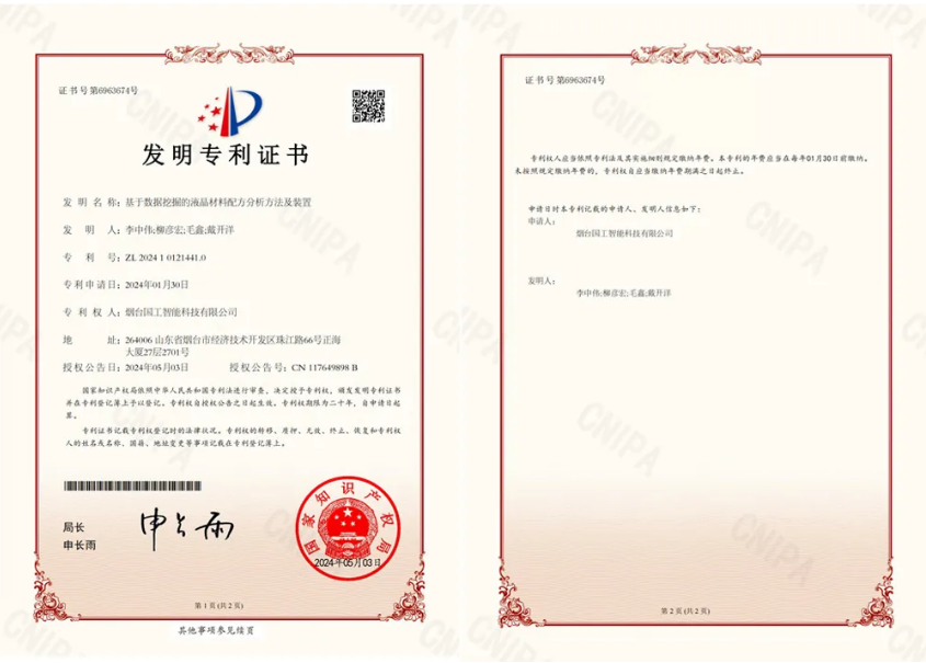 近日,國(guó)工智能新添國(guó)家知識(shí)產(chǎn)權(quán)局頒發(fā)的一項(xiàng)發(fā)明專(zhuān)利證書(shū)“基于數(shù)據(jù)挖掘的液晶材料配方分析方法及裝置”。