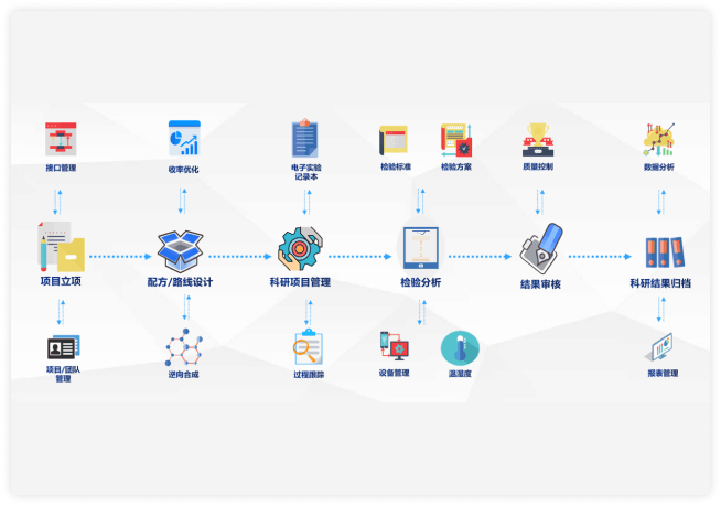 建立標準的研發管理流程MAI-DEV以數據大腦為引擎,建立標準的研發管理流程,通過對項目立項、項目計劃、科研任務、開題、實驗記錄、項目結題為核心的項目節點的監督執行,完成對整個研發項目生命周期的管理。 結合MAI-CLI的自我學習能力,實現化合物的逆向推導、目標分子的收率優化,在推動科研效率的同時,幫助企業搭建智能化研發管理平臺,為企業核心競爭力賦能。